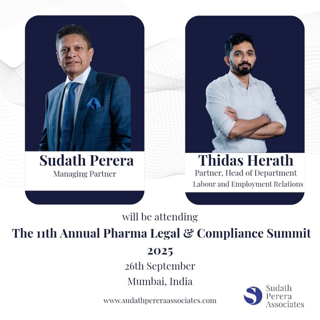 Our Managing Partner, Sudath Perera, and the firm’s Head of Labour & Employment Relations, Thidas Herath, will be in #Mumbai, #India for the 11th Annual Pharma Legal & Compliance Summit, organised by Lex Witness – India’s 1st Magazine on Legal & Corporate Affairs, to be held on 26th September 2025 at the Taj Santacruz hotel.