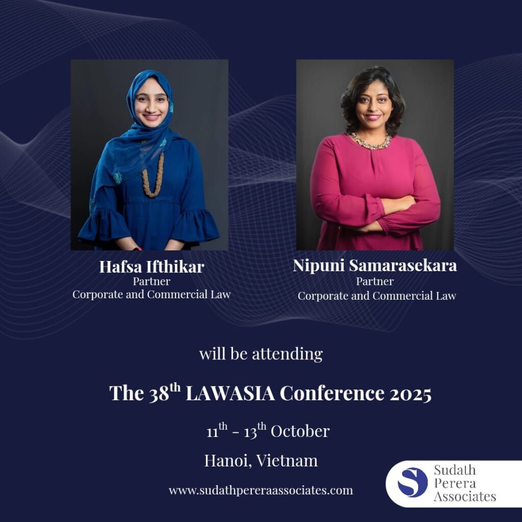 Hafsa Ifthikar and Nipuni Samarasekara, Partners in the firm's Corporate & Commercial Law Department, will be attending the 38th LAWASIA (The Law Association for Asia and the Pacific) Conference 2025 in Vietnam, from 11th to 13th October. Please e-mail info@sudathpereraassociates.com or contact them directly to arrange any meetings.