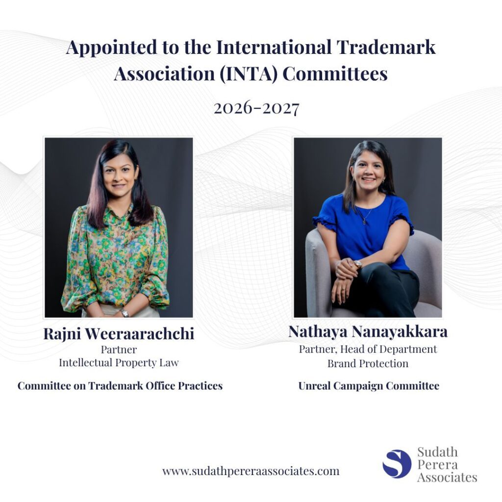 We are pleased to share that Rajni Weeraarachchi, Partner in our IP Department, has been appointed to the International Trademark Association (INTA) Committee on 'Trademark Office Practices', and Nathaya Nanayakkara, Partner in our BrandProtection Department, has been appointed to the #INTA 'Unreal Campaign' Committee, for the 2026-2027 term. The INTA 'Trademark Office Practices' Committee evaluates and recommends improvements to trademark office practices, procedures, operations and regulations, at the national, regional, and international levels. The INTA 'Unreal Campaign' Committee is a consumer awareness initiative to educate those aged 14 to 23 about the importance of trademarks and brands and the dangers of purchasing counterfeit products.