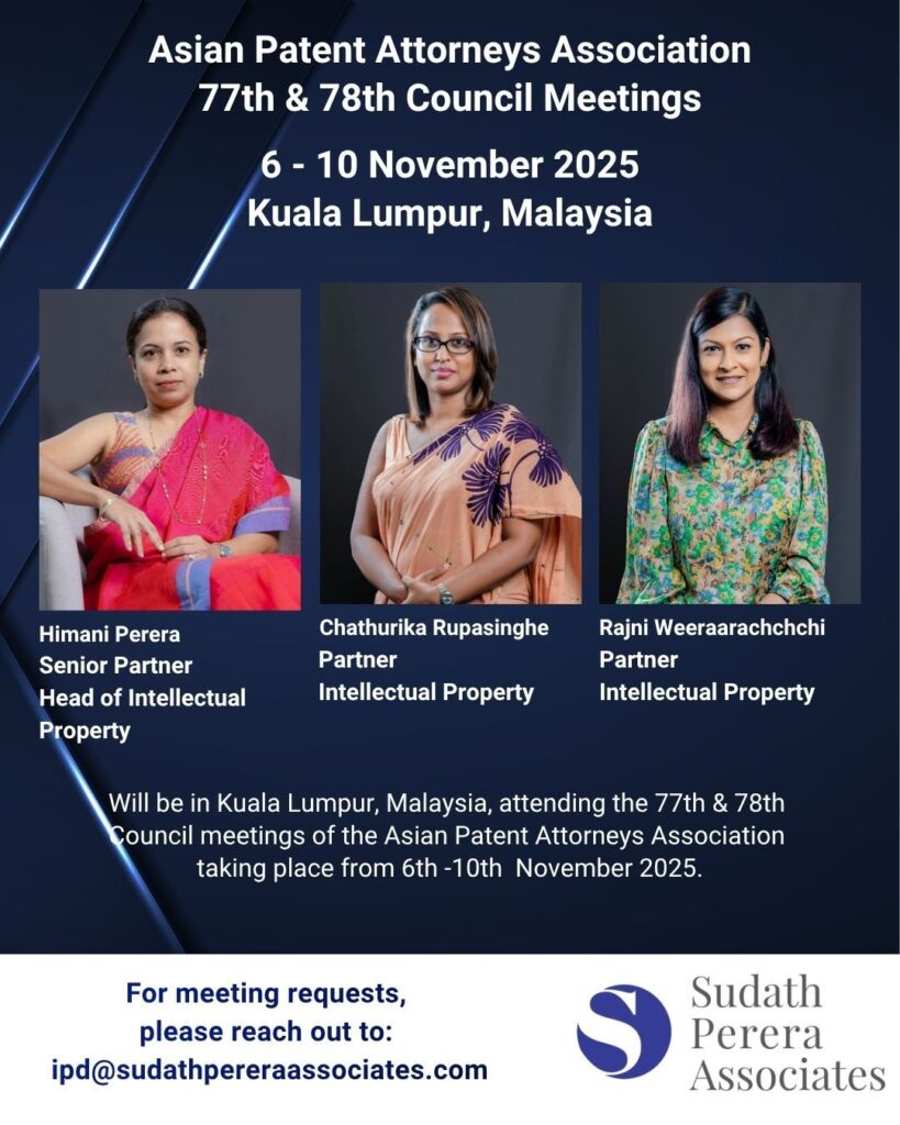 Our Head of Intellectual Property, Himani Perera, and other partners from the firm's #IP Department, Chathurika Rupasinghe and Rajni Weeraarachchi, will be in Kuala Lumpur, attending the 77th & 78th Council meetings of the Asian Patent Attorneys Association taking place from 6th -10th November 2025. Please reach out to them via ipd@sudathpereraassociates.com for meeting requests.